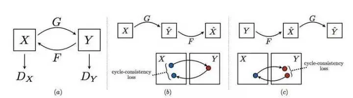 这个网络的基本原理,是训练两对生成器和鉴别器把图像从一个域转移到另一个域,在这个过程中需要保持循环一致性——在生成器一系列应用之后,我们预计可以得到一个类似于原始 L1 损失图像。为确保生成器将与原图像完全不相关的一个域传送到另一个域,我们需要一个循环损失。