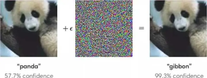 人们对对抗性攻击的探索同样很积极。那么,什么是对抗性攻击?例如,经过 ImageNet 训练的标准网络在为分类图片添加特殊噪声时,是完全不稳定的。在下面的例子中,我们看到人眼噪声图片几乎没有变化,但模型却给出了一个完全不同分类的预测。