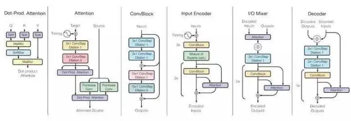 为了实现这个目标,他们建立了一个复杂的网络结构,用不同的区块来处理不同的输入数据并生成结果。编码器 / 解码器的区块分为三种类型:卷积、注意力和 gated mixture of experts (MoE)。