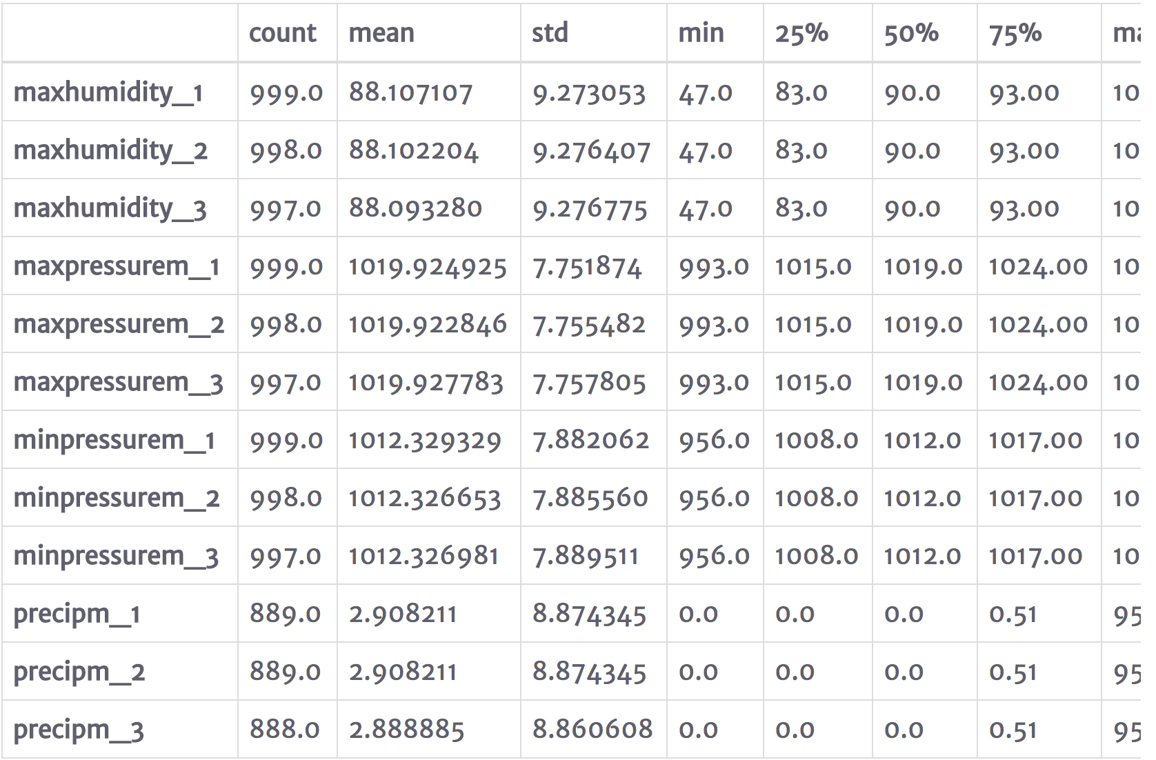 features = ["date", "meantempm", "meandewptm", "meanpressurem", "maxhumidity", "minhumidity", "maxtempm",