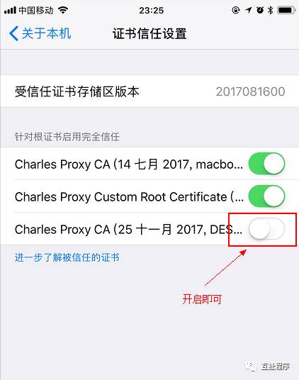 虽然charles的根证书已经在安装列表中显示,但它是被关闭的。在iOS 10.3之前,当你将安装一个自定义证书,iOS会默认信任,不需要进一步的设置。而iOS 10.3之后,安装新的自定义证书默认是不受信任的。如果要信任已安装的自定义证书,需要手动打开开关以信任证书。