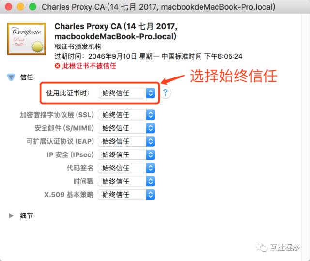 SSL的问题:最近iPhone系统更新到ios 10.3后,用Charles抓包竟然出现了一些问题,https的请求都会失败,提示错误信息为Failure SSLHandshake: Received fatal alert: unknown_ca 和You may need to configure your browser or application to trust the Charles Root Certificate. 然而之前任何问题都没有,并且相关设置都正确:电脑上安装了Charles的根证书,并且设置了始终信任,然后手机上也登录了http://chls.pro/ssl安装了描述文件,一切都按正常程序走的,但是错误始终无法解决.