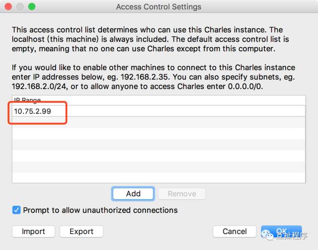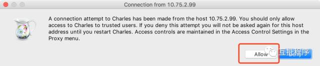 如果不小心点击了拒绝,可以手动添加手机IP/Mac地址到允许访问列表,或者重启Charles,手机再次访问,会再次提示选择。