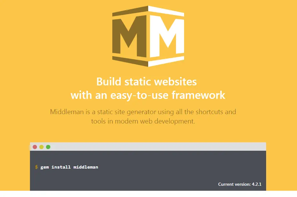 Middleman 是一个 Ruby 编写的静态网站生成器,他可以让你使用几乎所有在Ruby Web开发中所使用的技术和工具来构建各种类型的静态网站。比如:在 Ruby on Rails 经常用到的 Sass、CoffeeScript、 Sprockets、Erb & Haml 等,都可以在 Middleman 里使用。