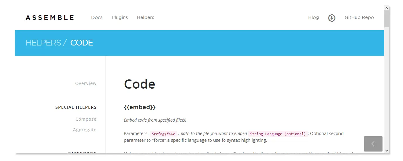 Assemble 是一个使用 Node.js,Grunt.js,Gulp,Yeoman 等来实现的静态网页生成系统。已被 Zurb Foundation, Zurb Ink, H5BP/Effeckt, Less.js / lesscss.org, Topcoat, Web Experience Toolkit 等数百个项目用来生成项目网站、主题、组件、文档、博客和 github 页面。