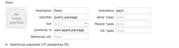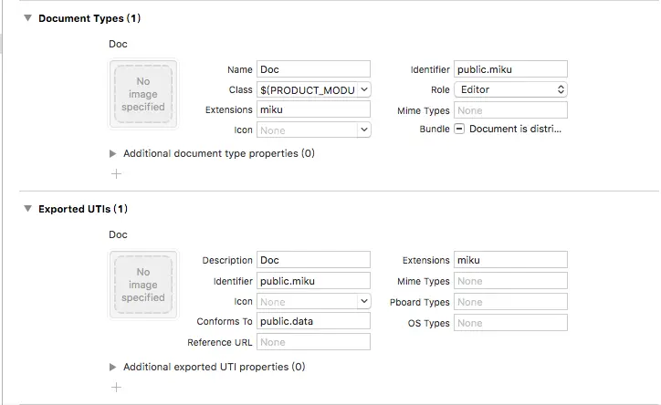 若是App只是使用已有的文档类型如jpg,则是在Document Types中设置就已经足够了,但是若要试用自定义类型的话,则需要用到
