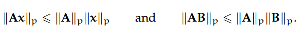 这一系列的范数被称为「归纳(induced)」,因为它们是通过不取决于 A 和 p 的非零向量 x 而实现的。因此,一般存在一个单位范数向量(p-范数中的单位范数)x 令||A||p = ||Ax||p。归纳矩阵 p-范数遵循以下 submultiplicativity 法则: