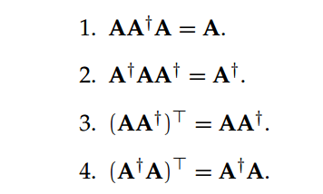 对于非方矩阵而言,其逆矩阵是没有定义的。而一种非常出名的推广型矩阵求逆方法 Moore-Penrose 伪逆在这类问题上取得了一定的进展。形式上来说,若给定 m×n 阶矩阵 A,那么如果矩阵 A† 满足以下属性,它就是矩阵 A 的 Moore-Penrose 伪逆: