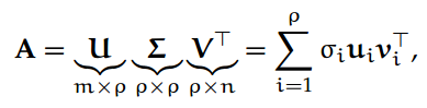 其中 U ∈ R^m×ρ和 V ∈ R^n×ρ是包含对应于非零奇异值的左、右奇异向量的两两正交列(即 U^TU = I 且 V^TV = I)的矩阵;Σ ∈ R^ρ×ρ是 A 的非零奇异值在对角线上递减的对角矩阵。