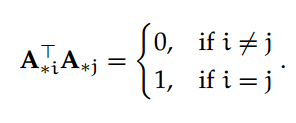 正交矩阵:如果矩阵 A ∈ R^n×n 满足 A^⊤=A^−1,则称 A 为正交矩阵。等价地说,对所有 i , j 属于 [1,n],正交矩阵满足: