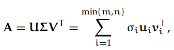 我们经常使用 u_i(或 v_j),i=1,..., m(或 j=1,..., n)来表示矩阵 U(或 V)的列。同样,我们将使用σ_i,i = 1,..., min{m, n} 来表示奇异值: