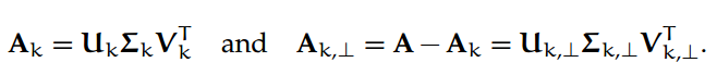 我们会经常使用这些符号:让 U_k ∈ R^m×k(或 V_k ∈ R^n×k)表示矩阵 A 的最前 k 个左(或右)奇异向量的矩阵;让 Σ_k ∈ R^k×k 表示包含 A 的最前 k 个奇异值的对角矩阵。同样的,让 U_k,⊥ ∈ R^m×(ρ−k)(或 V_k,⊥ ∈ R^n×(ρ−k))表示 A 的底部ρ-k 个非零左(或右)奇异向量的矩阵;然后令Σ_k,⊥ ∈ R^(ρ−k)×(ρ−k) 表示包含 A 的底部ρ-k 个奇异值的对角矩阵。然后,