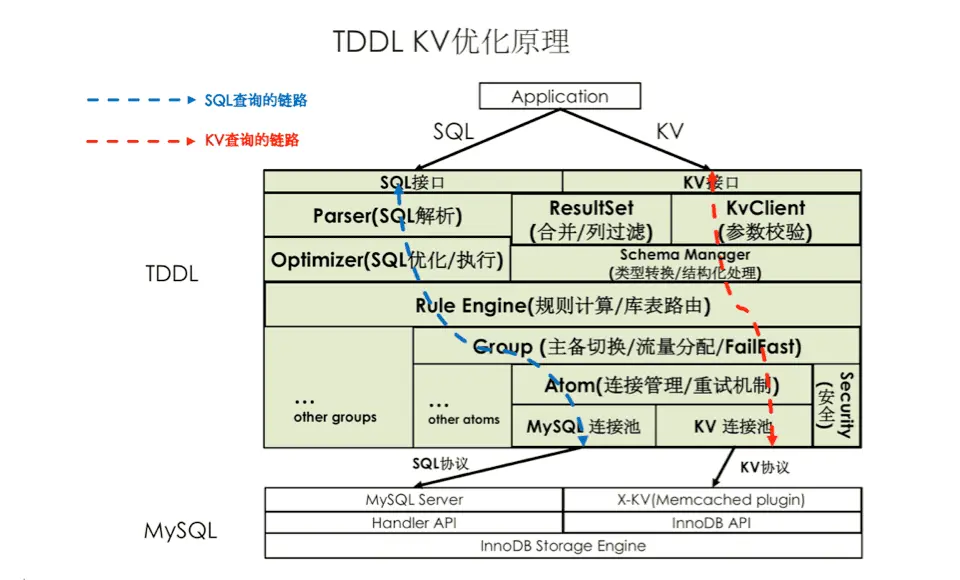 在 TDDL/DRDS 中,一个类 KV 查询走 SQL 接口与走 KV 接口却有着本质的不同,它们分别使用不同的端口来与MySQL进行通信。因此,这使TDDL在内部要维护两套不同的连接池,以及要处理两种不同的查询链路。