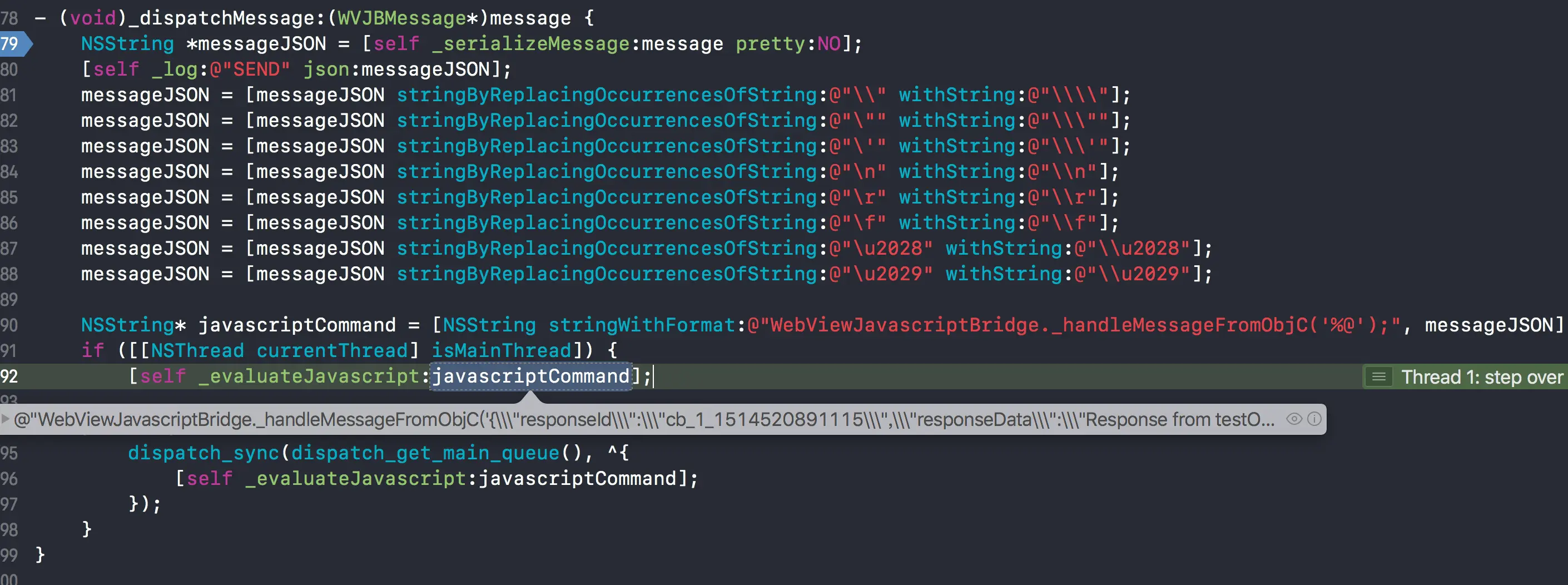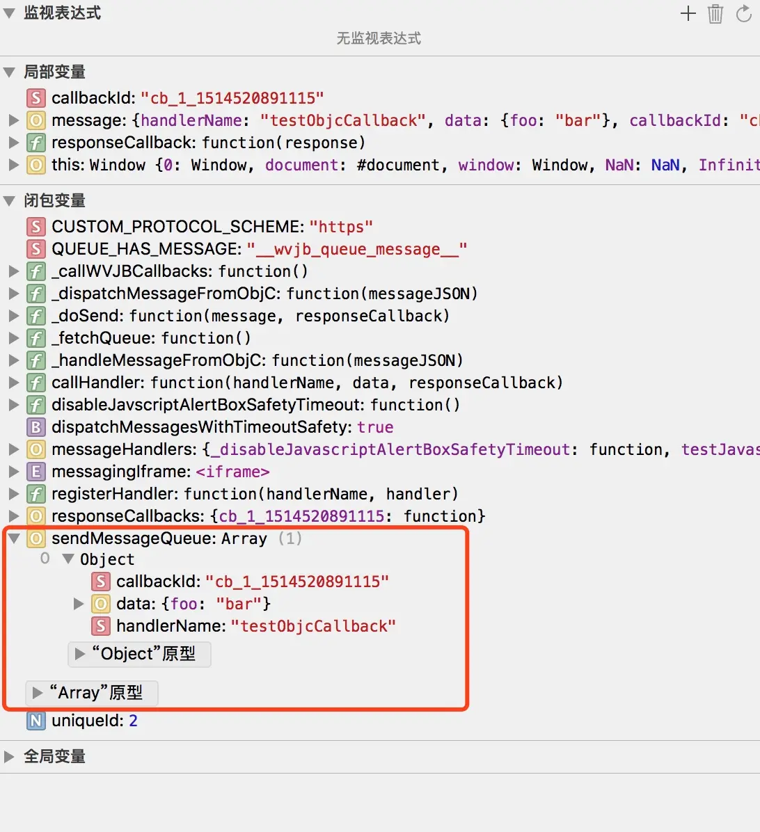 sendMessageQueue是一个在js中维护的消息队列,是一个数组sendMessageQueue拿给oc然后将数据清空,在上面的这个oc函数evaluateJavaScript中result就是该js方法的返回值,即消息队列[{"handlerName":"testJavascriptHandler","responseId":"objc_cb_4","responseData":{"Javascript Says":"Right back atcha!"}}]