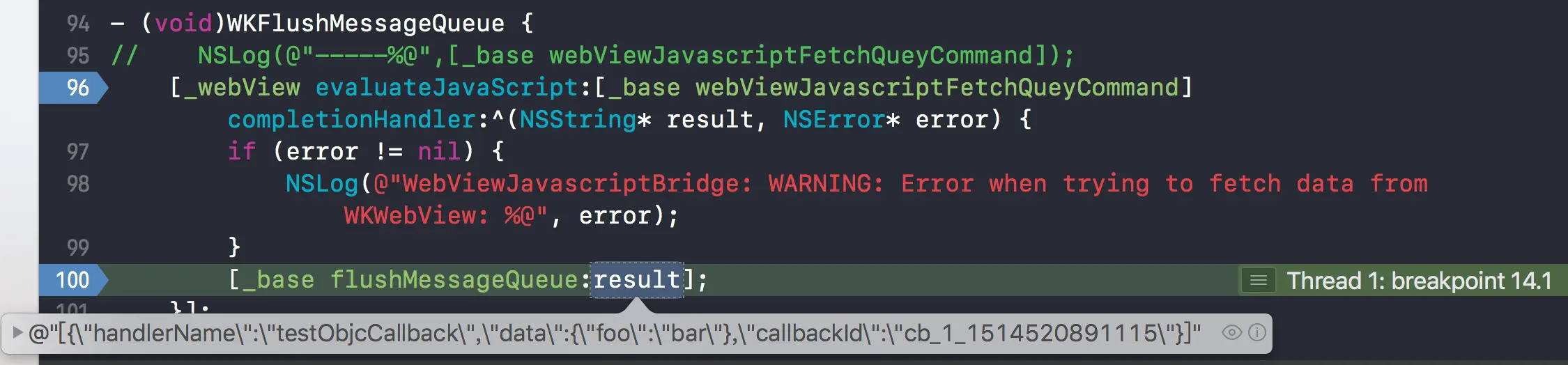 NSLog(@"testObjcCallback called: %@", data);