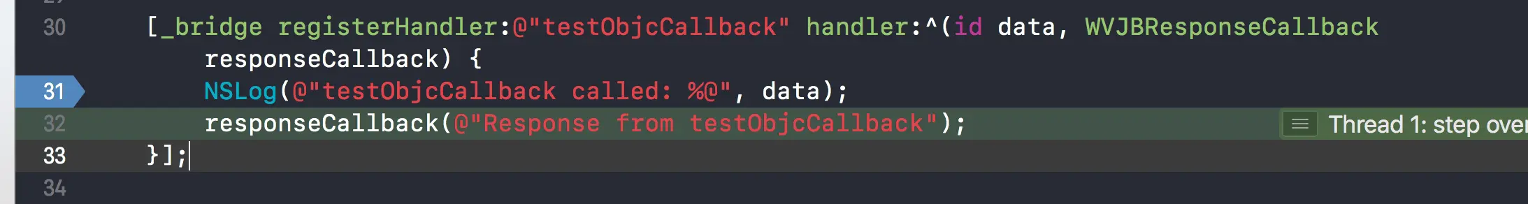 [_bridge registerHandler:@"testObjcCallback" handler:^(id data, WVJBResponseCallback responseCallback) {