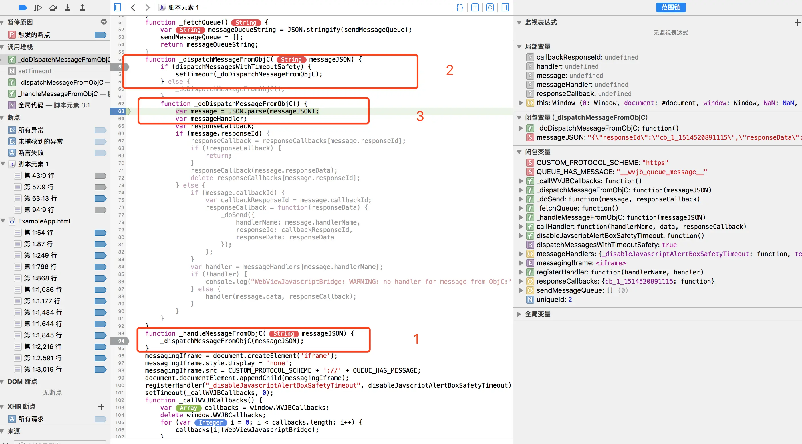 要搞明白其调用逻辑,最好是用Safari连上调试一把哈,在网页检查其中我们用oc载入的js代码好难找啊(至少我是花了一番功夫才找到了),莫慌,是在找不到的话在搜索栏里面搜一下WebviewJavascriptBridge,然后在对应的代码出都打上断点,这下就可以研究了
