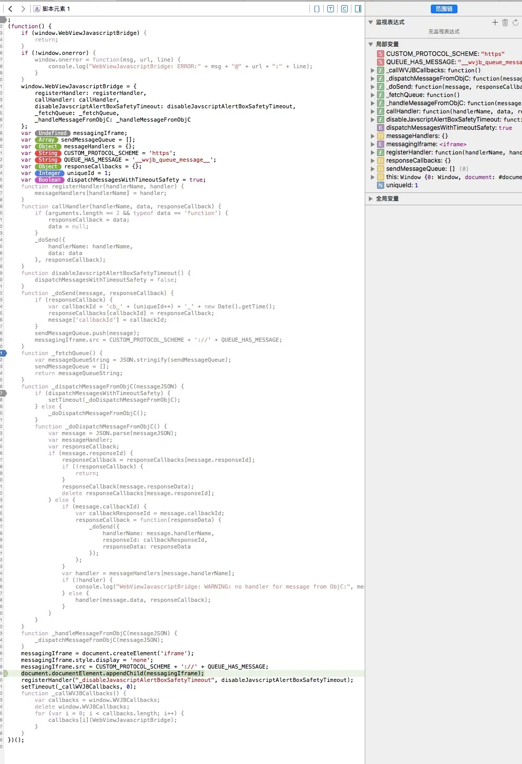 红线框出来的部分也就是就是WebviewJavascriptBridge框架的核心代码部分
