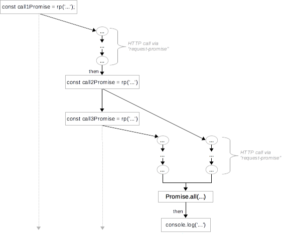 我们先呼叫第一次HTTP请求,然后预备一个在它完成时执行的回调(第1-3行)。在回调里,我们为另外两次请求制造了promise(第8-9行)。这两个promise并发运行,我们需要计划一个在两个都完成时执行的回调,于是,我们通过Promise.all(第11行)来讲他们合并。这第一个回调的返回值是一个promise,我们再添加一个then来输出结果(第12-16行)。