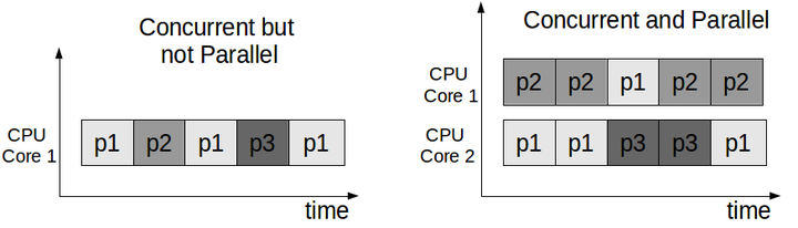 学院派的人会指出,并发与并行是有区别的(译者:所以前文都是说并发,而非并行)。参见Rob Pike的讲话或者我之前的博文。并发是组合多个独立过程来一起工作,并行是多个过程同时执行。并发是体现在应用的结构设计,并行是实际执行的方式。