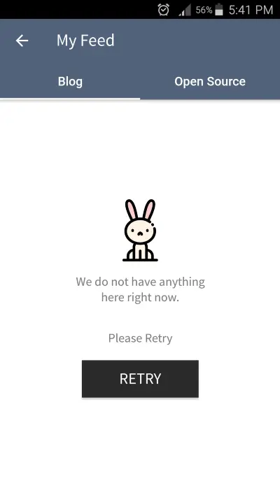 OpenSourceAdapter 和 BlogAdapter 是 RecyclerView.Adapter<BaseViewHolder> 的实现类。在本项目中,当没有可用数据的时候会显示一个空视图。用户可以点击 RETRY 按钮来重新获取数据,并在获取到数据的时候删除该空视图。