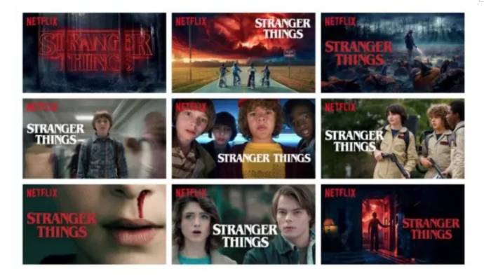 Netflix通过多臂老虎机算法(multi-armed bandits ) ,为视频找到最合适的配图,以《怪奇物语》为例,基于用户的品味和偏好,找到每个用户偏好的点,在配图中能呈现出他们最感兴趣的东西,激发他们点击的热情,如下图所示。