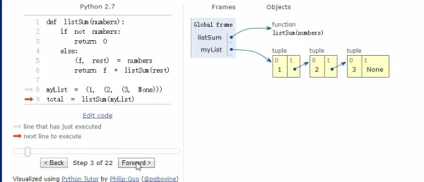 Python Tutor 是由 Philip Guo 开发的一个免费教育工具,可帮助学生攻克编程学习中的基础障碍,理解每一行源代码在程序执行时在计算机中的过程。通过这个工具,教师或学生可以直接在 Web 浏览器中编写 Python 代码,并逐步可视化地运行程序。如果你不知道代码在内存中是如何运行的,不妨把它拷贝到Tutor里可视化执行一遍,加深理解。