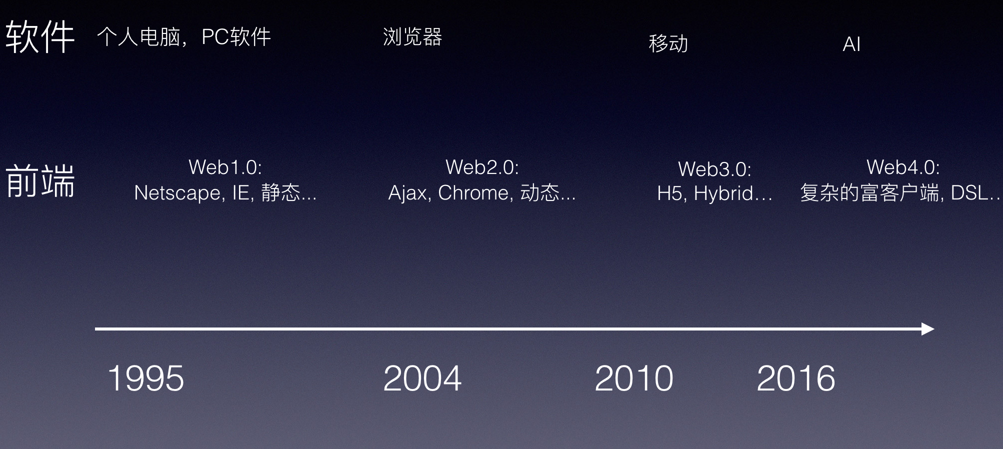 回顾过前端的演化,主要参见最底下的相关资源,下图简要回顾一下95年以来软件开发和前端历史: