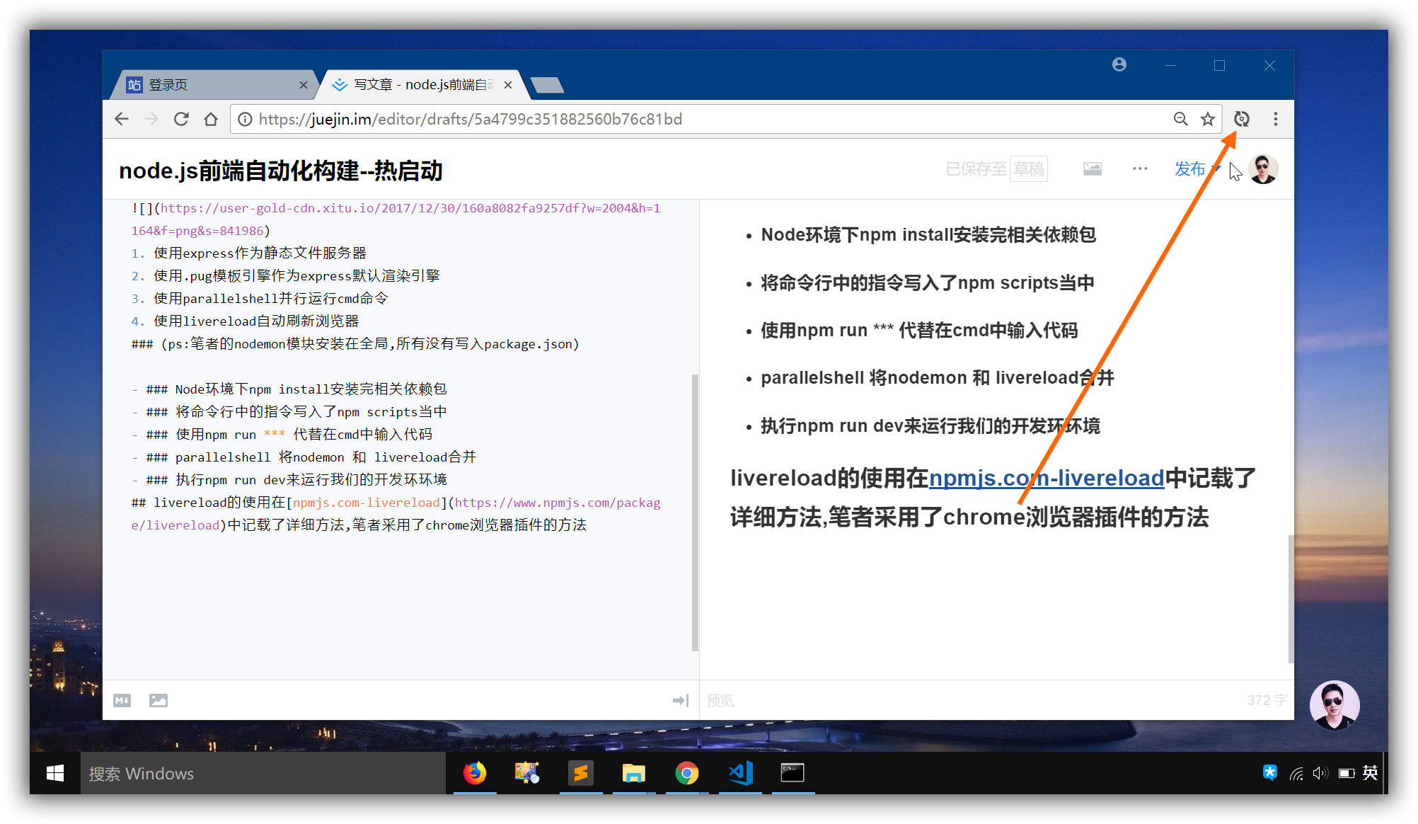 livereload的使用在npmjs.com-livereload中记载了详细方法,笔者采用了chrome浏览器插件的方法