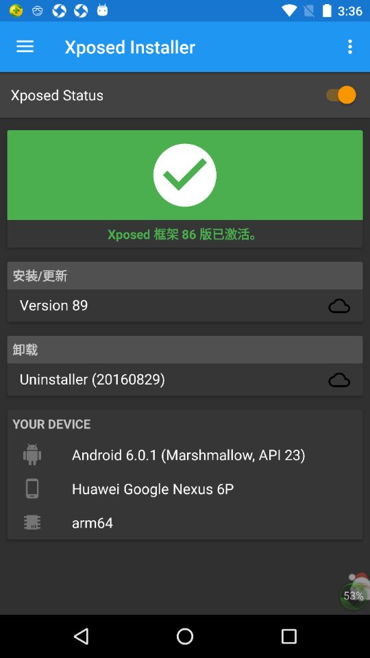 首先,使用Xposed需要设备是root的,因为安装Xposed框架需要root权限,使用过程不需要root,当然网上可以找到"免root使用Xposed之类的文章",有兴趣的同学可以去研究,这里需要注意的是:在安装Xposed框架的时候,要选择跟自己的手机版本相符合的,不然很容易失败,甚至设备变砖,特别是第三方深度定制的系统,在应用层开发都一堆兼容性问题,底层的问题可能会更多,因此要注意选择好对应的版本就好了,安装Xposed的过程就不讲了,自己参考,一般能找到对应版本的话,应该问题不难,在这里以Google Nexus6,Android 6.0.1版本为说明,如果你安装之后看到类似下面的,说明已经激活成功了,