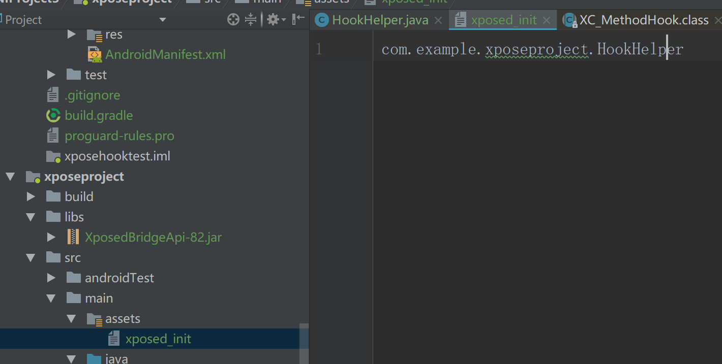 ● 进行Hook文件的配置,我们需要在assets目录下面新建一个xposed_init文件,写上我们Hook文件的路径,如图: