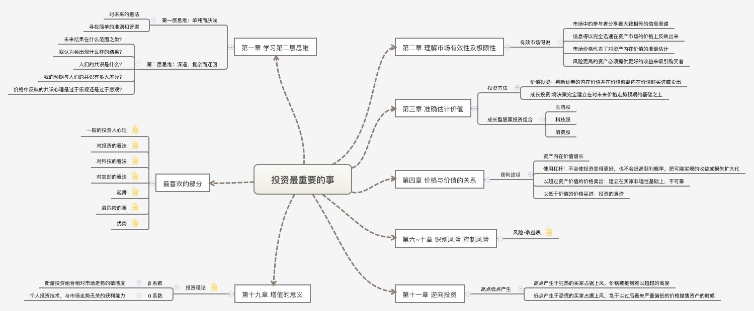 「投资最重要的事」里告诉我们的启示是,要么进行价值投资,要么进行成长投资。价值投资是指目标内在具有的高价值属性,以低于价值的价格买进;成长投资是指目标有高潜力属性,即使买入时价格与价值相近,在未来具有不错的想象空间。具体内容框架参见思维导图。