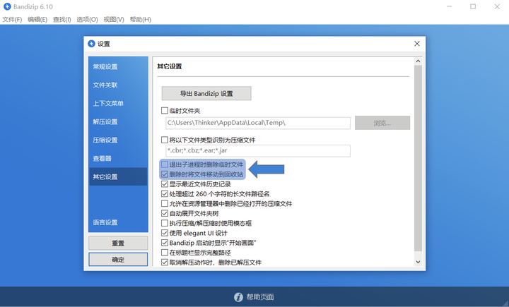 而在 Bandizip 里可以设置关闭程序之后不删除临时文件,和删除文件时不直接删除而是移动到回收站,所以尽管我已经养成了每次用 Office 都另存为而不是保存的习惯,但以防万一我还是把 WinRAR 删了改用 Bandizip。