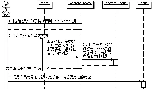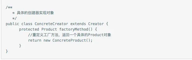 - ConcreteCreator:具体的创建器对象,覆盖实现Creator定义的工厂方法,返回具体的Product实例。