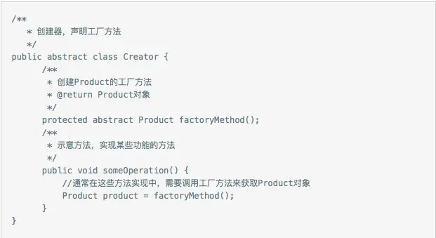- Creator:创建器,声明工厂方法,工厂方法通常会返回一个Product类型的实例对象,而且多是抽象方法。也可以在Creator里面提供工厂方法的默认实现,让工厂方法返回一个缺省的Product类型的实例对象。