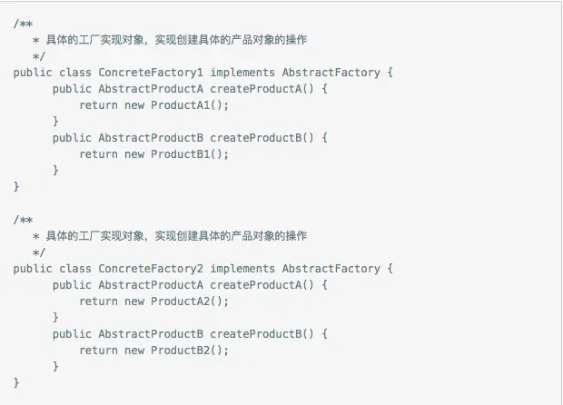 - ConcreteProduct:具体的产品实现对象,通常在具体工厂里面,会选择具体的产品实现对象,来创建符合抽象工厂定义的方法返回的产品类型的对象。