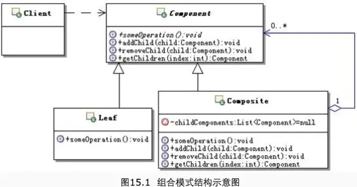 Client:客户端,通过组件接口来操作组合结构里面的组件对象。