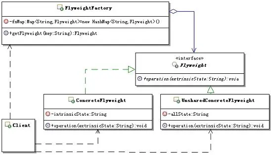 UnsharedConcreteFlyweight:非共享的享元实现对象,并不是所有的Flyweight实现对象都需要共享。非共享的享元实现对象通常是对共享享元对象的组合对象。
