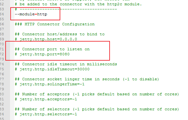 jetty9 以后,jetty 取消了 xml 配置,改为使用 module 模块,start.ini 文件中,http 模块下可以直接配置端口