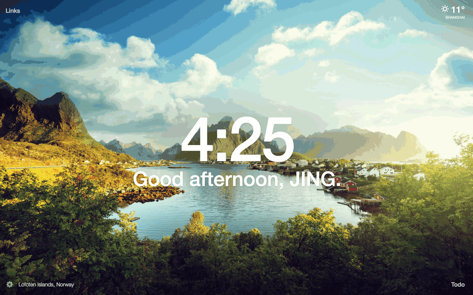 安装完 Momentum 后,你的浏览器启动页面将会是如下所示。背景图将会随机变换。并且你还可以点击右下角的 Todo,来增加待办事项。这款插件胜在简洁、明朗。
