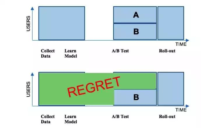 经典的策略升级采用的是基于ABTest的方法,简单来说,就是离线训练新算法,上线ABTest和老算法进行比较,如果效果优于老算法,则将新算法全量切换。这种方法有个问题,就是会导致regret[2]:长时间内很多用户都无法享受到新算法的更好体验。这个过程如下图所示: