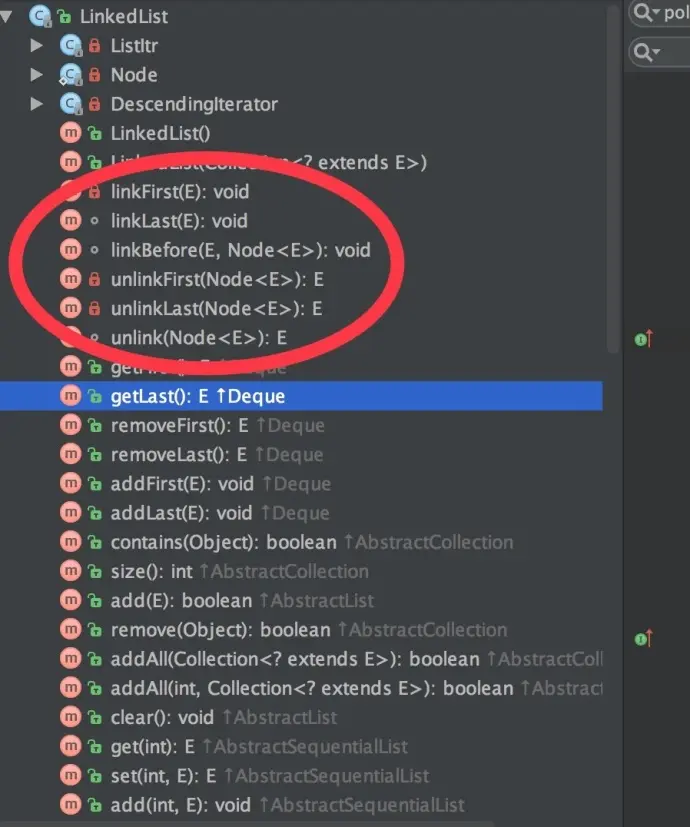 好了,来通过几个核心的API来看下LinkedList这个双向链表是如何实现这么多语义的: