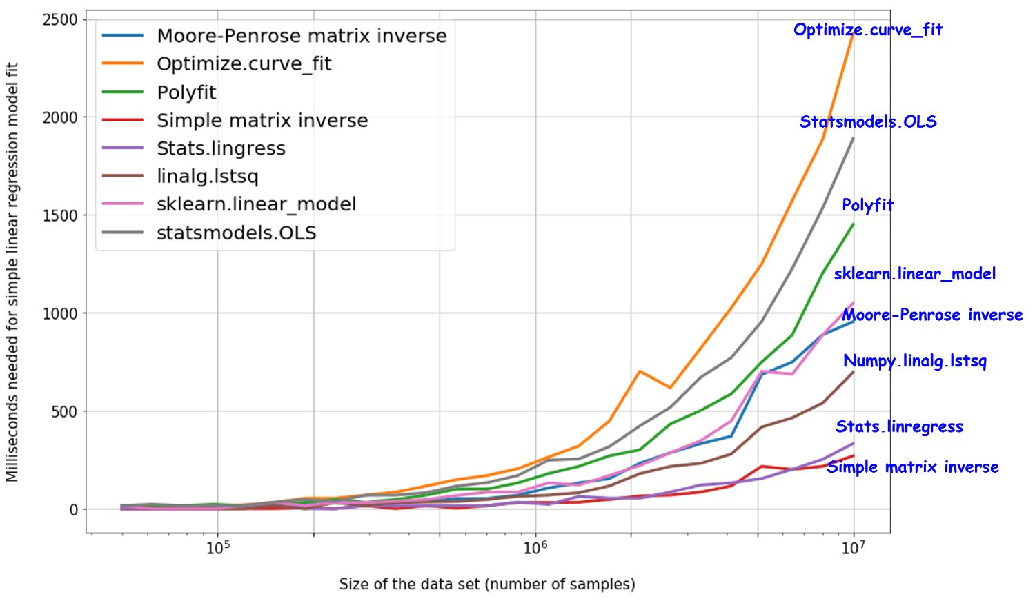 这篇文章首要目标是讨论上述 8 种方法相关的速度/计算复杂度。我们通过在一个合成的规模逐渐增大的数据集(最大到 1 千万个样本)上进行实验,我们测出了每种方法的计算复杂度。令人惊讶的是,简单矩阵求逆乘法的解析解竟然比常用的 scikit-learn 线性模型要快得多。