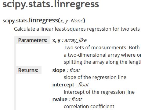 这是 Scipy 中的统计模块中的一个高度专门化的线性回归函数。其灵活性相当受限,因为它只对计算两组测量值的最小二乘回归进行优化。因此,你不能用它拟合一般的线性模型,或者是用它来进行多变量回归分析。但是,由于该函数的目的是为了执行专门的任务,所以当我们遇到简单的线性回归分析时,这是最快速的方法之一。除了已拟合的系数和截距项(intercept term)外,它还会返回基本的统计学值如 R² 系数与标准差。