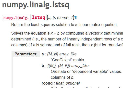 详细描述参考:https://docs.scipy.org/doc/numpy-1.13.0/reference/generated/numpy.linalg.lstsq.html#numpy.linalg.lstsq