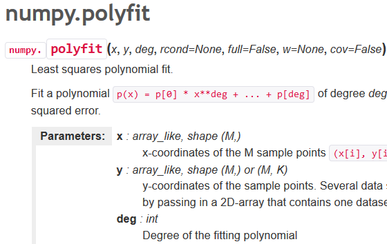 详细描述参考:https://docs.scipy.org/doc/numpy-1.13.0/reference/generated/numpy.polyfit.html。