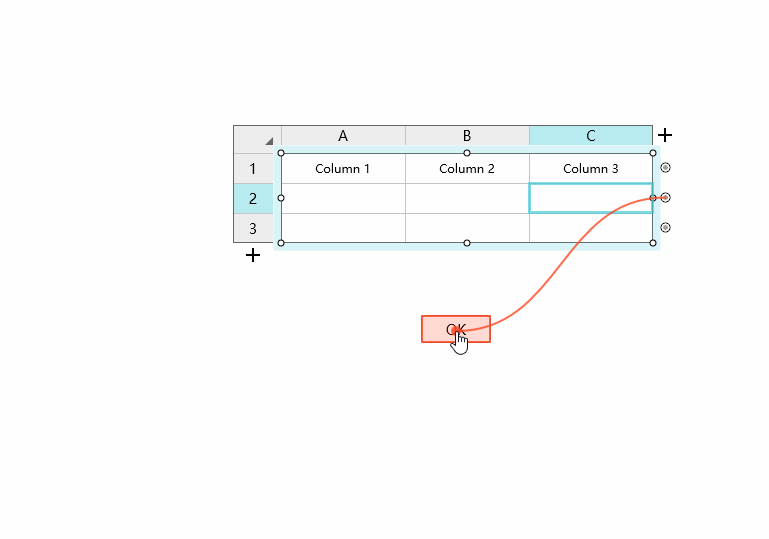 通过观察可以发现,Mockplus有很大一点不同于Axure,Mockplus的表格增加了辅助栏,进行拖拽的时候直接在辅助栏上进行,这个特点和Excel表格很接近,容易让人上手,并且,在Mockplus的表格中拖拽时,会有一条暗红色的可视化编辑线,指示很清楚。