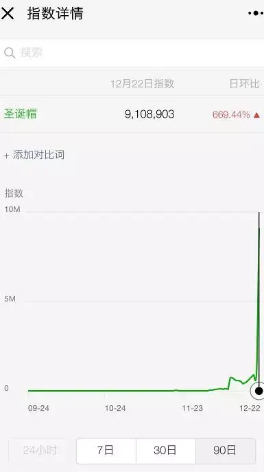 圣诞帽环比增加了665%,可见24H小时曲线图,其出现的增幅多么可怕。
