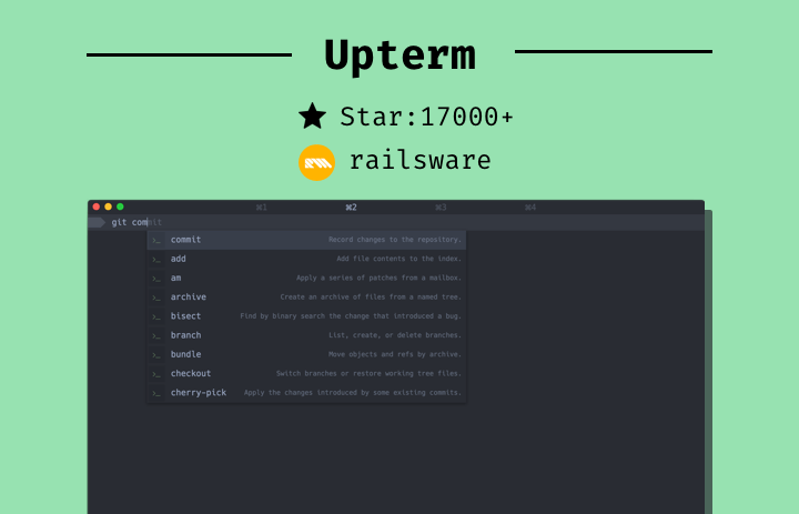 其实本来想推荐 fish 或者 zsh,但其实这两个我也主要是贪图自动补全这个特性。最近在用的这个 Upterm 其实很简单好用,它是一个全平台的终端,可以说是终端里的 IDE,有着强大的自动补全功能。之前的名字叫 BlackWindow,有人跟他说这个名字不利于社区推广,改名叫 Upterm 之后现在已经17000+ Star了。