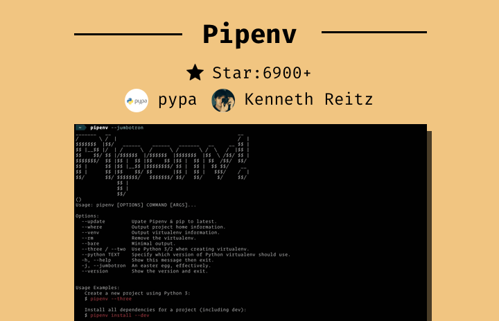 这个库相当于是环境管理和包管理二合一,由 Kenneth Reitz (Requests 的作者 )编写,现在移交给 Python 官方来维护,提供比 pip 体验更好的开发包管理。它的 Slogon 是Python Development Workflow for Humans,用来解决各种环境不一致、安装包的问题。
